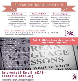 - Fill out application form for 2015 InKAS Spacial scholarship offer(Fall & Winter) ▷ Submit the completed form with all proper required documents(http://www.inkas.org/en/myservices/application/61/)